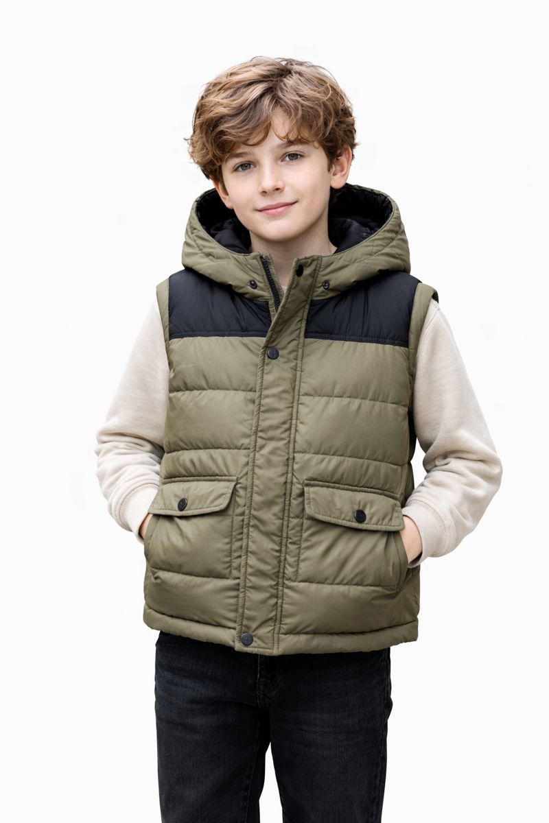 صديري أولادي أخضر زيتي بتفاصيل سوداء عصرية، مزود بغطاء رأس وأزرار أمامية مع جيوب عملية ليمنح طفلك دفئًا مريحًا وإطلالة كاجوال أنيقة في الأجواء الباردة.