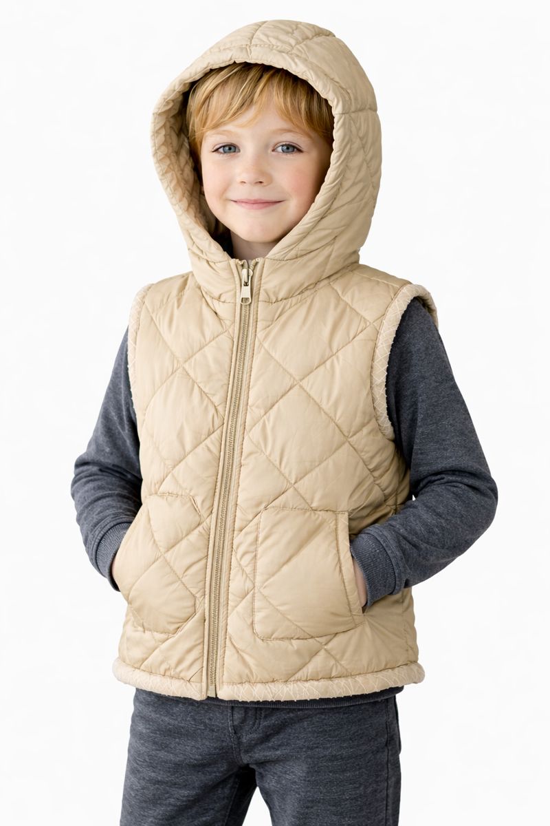 صديري أولادي بيج مبطن بتصميم دافئ وخفيف، مزود بغطاء رأس وسحاب أمامي ليمنح طفلك راحة وأناقة مناسبة للإطلالات اليومية في الأجواء الباردة.