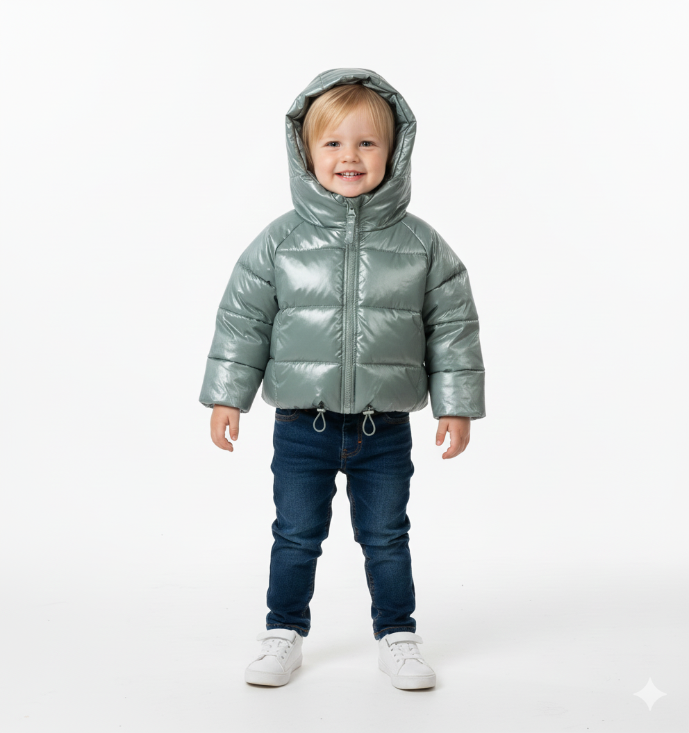 جاكيت أولادي رمادي فاتح بلمسة لامعة وتصميم مبطن دافئ، مزود بغطاء رأس وسحاب أمامي ليمنح طفلك راحة وأناقة عصرية في الأجواء الباردة.