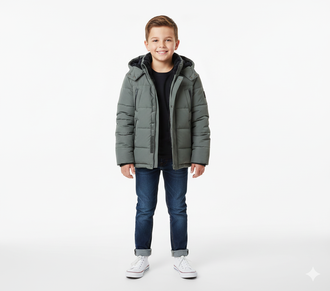 جاكيت أولادي أخضر زيتي مبطن بتصميم دافئ ومريح، مزود بغطاء رأس وسحاب أمامي ليمنح طفلك حماية مثالية وأناقة كاجوال في الأجواء الباردة.