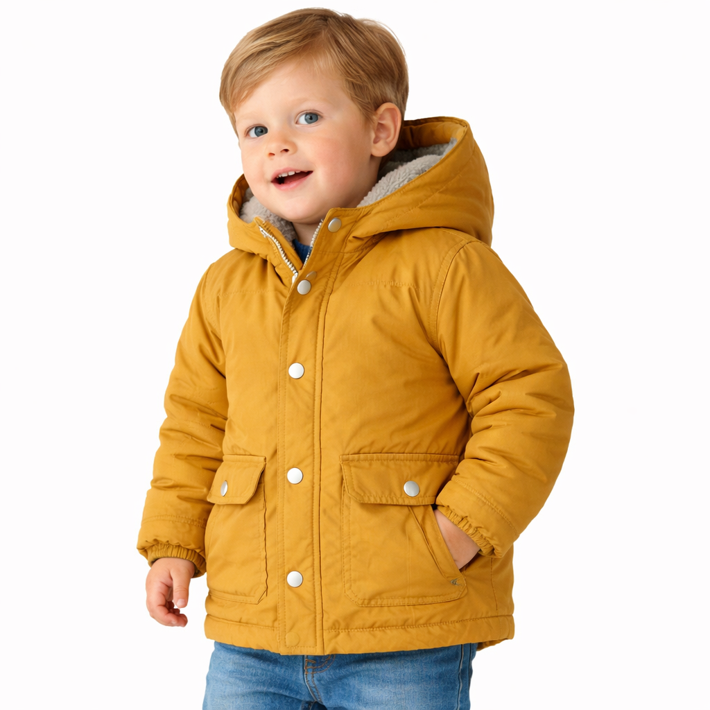جاكيت أولادي بلون أصفر خردلي دافئ، مزود بغطاء رأس وأزرار أمامية مع جيوب عملية ليمنح طفلك دفئًا وأناقة كاجوال مثالية للأجواء الباردة.
