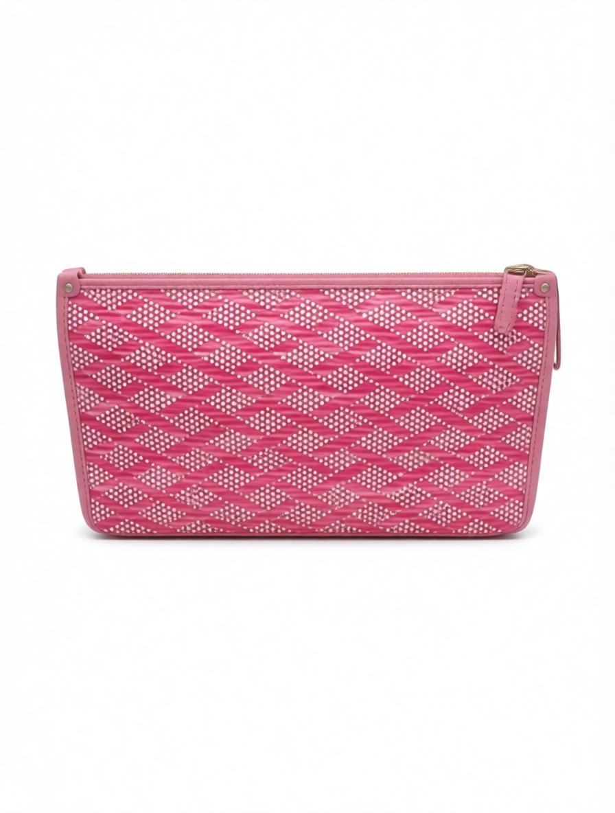 حقيبة إيطالية من (Alex Max) بلون وردي زاهٍ مزينة بنمط هندسي منقط، تأتي بتصميم "كلتش" مستطيل ونحيف يمنحكِ إطلالة عصرية ومرحة.