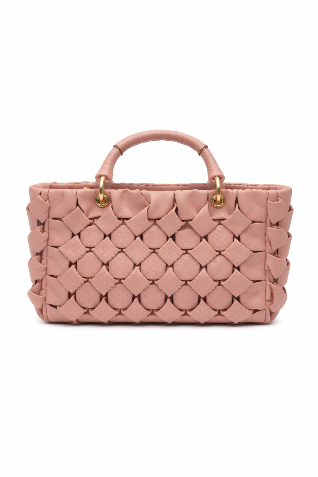 حقيبة إيطالية من (Alex Max) بلون وردي وتصميم منسوج بارز، تتميز بشكل مستطيل عصري ومقابض علوية صغيرة مع حلقات ذهبية لإطلالة أنثوية ناعمة.