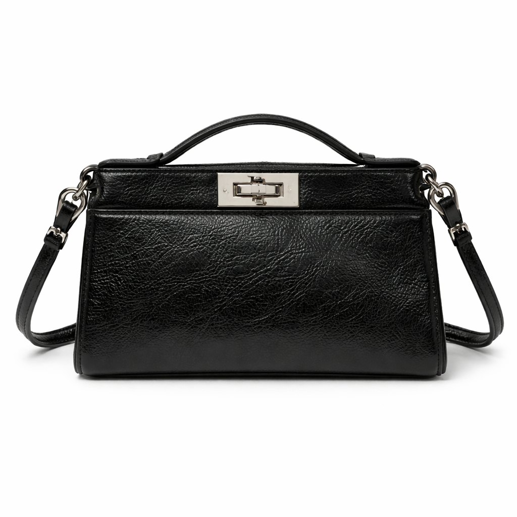 حقيبة يد أنيقة باللون الأسود مصنوعة من جلد لامع بملمس مميز يمنحها طابعًا فاخرًا. تتميز بتصميم هيكلي أنيق مع مقبض علوي وحزام طويل قابل للتعديل، إضافة إلى قفل معدني فضي يعزز من فخامتها وجاذبيتها.