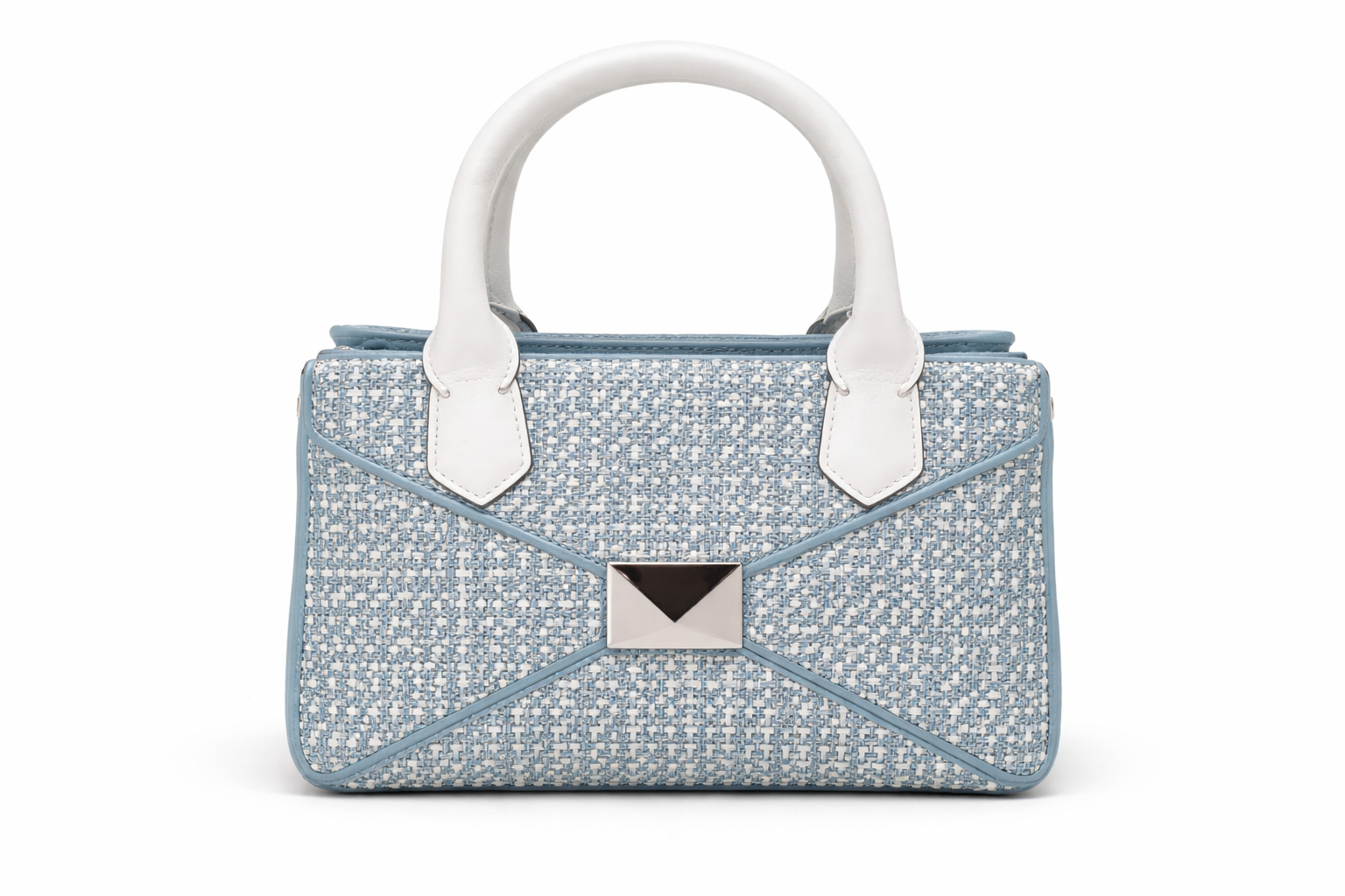 شنطة يد أنيقة من براند Alex Max بتصميم عصري يجمع بين الخامة المنسوجة باللون الأزرق الفاتح وتفاصيل جلدية بيضاء راقية. القفل المعدني الأمامي يضيف لمسة فخامة مميزة، مع هيكل منظم يمنح الشنطة شكلًا أنيقًا وثابتًا. اختيار مثالي من Alex Max لإطلالة صيفية ناعمة تجمع بين الأناقة والعملية في آن واحد.
