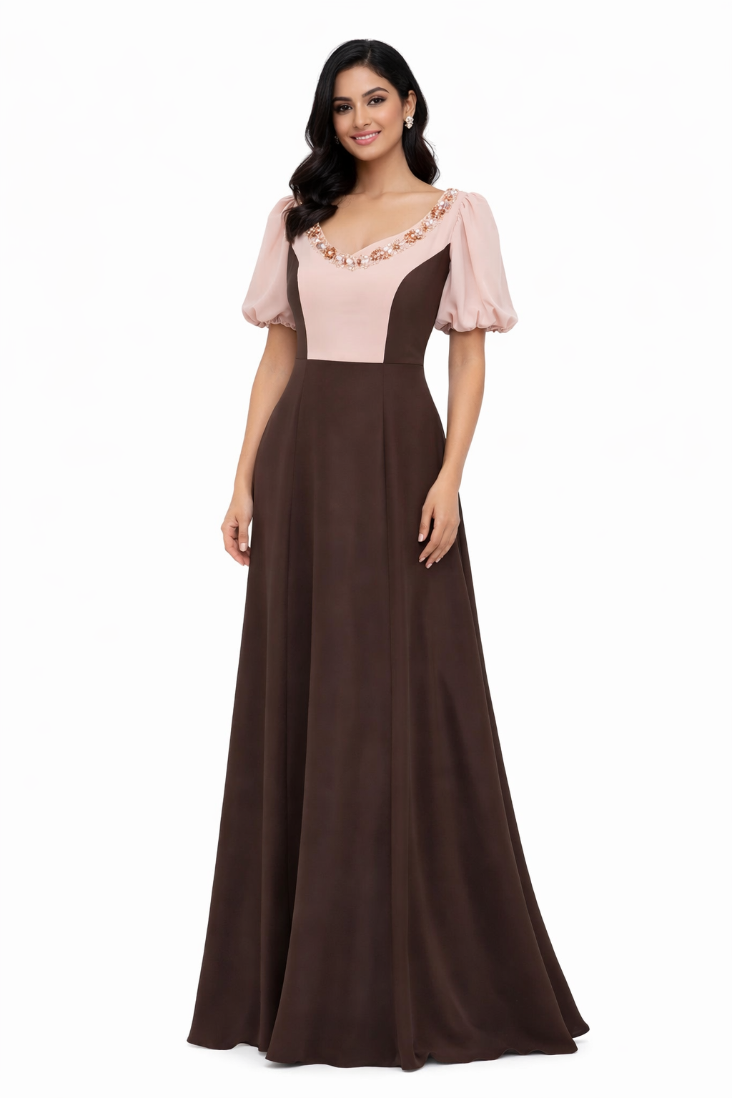 فستان فستان طويل بيج وبني أنيق بسلسلة ( Guess)