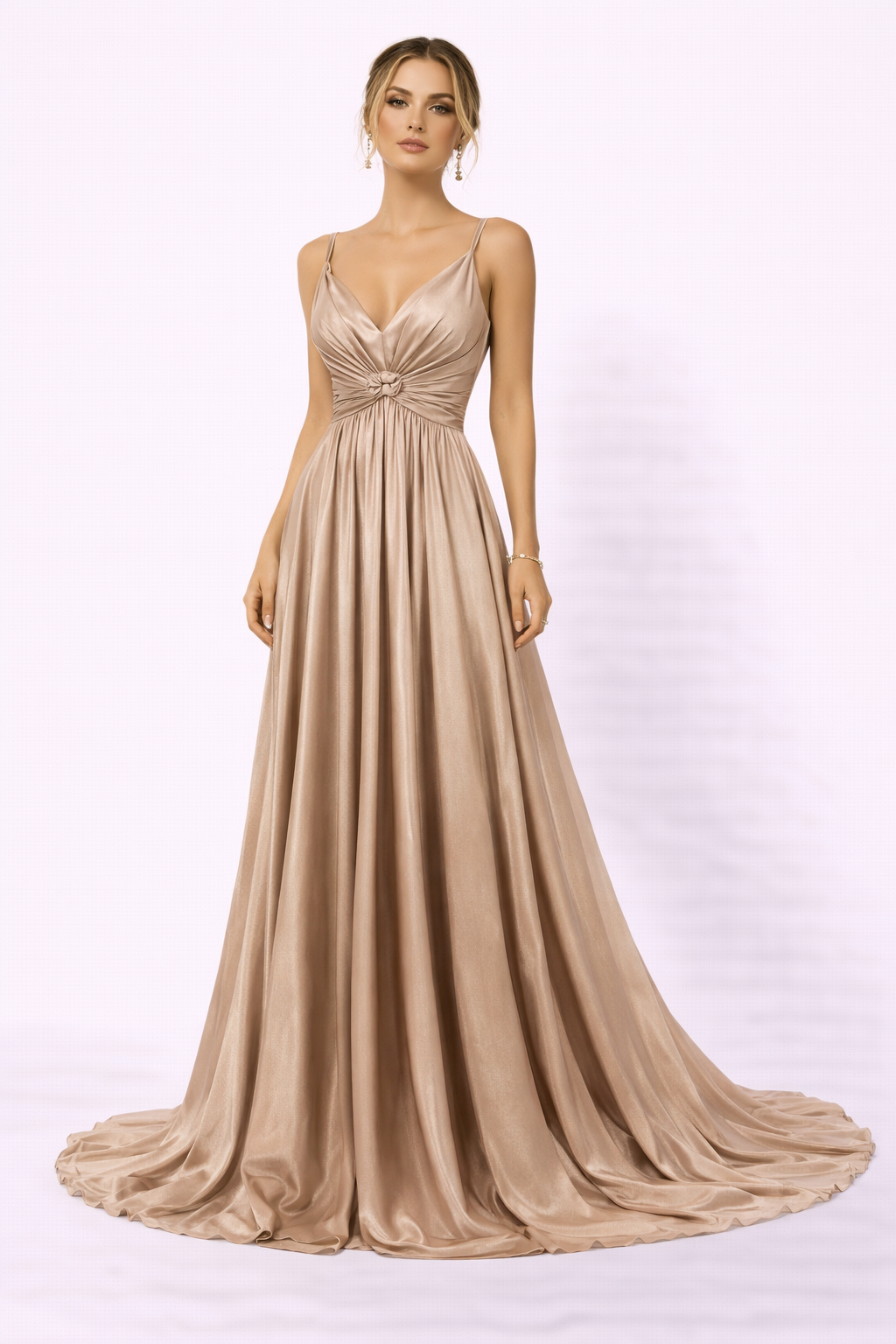 فستان سهرة ذهبي بلمعة ميتاليك وتصميم صدر (Guess)