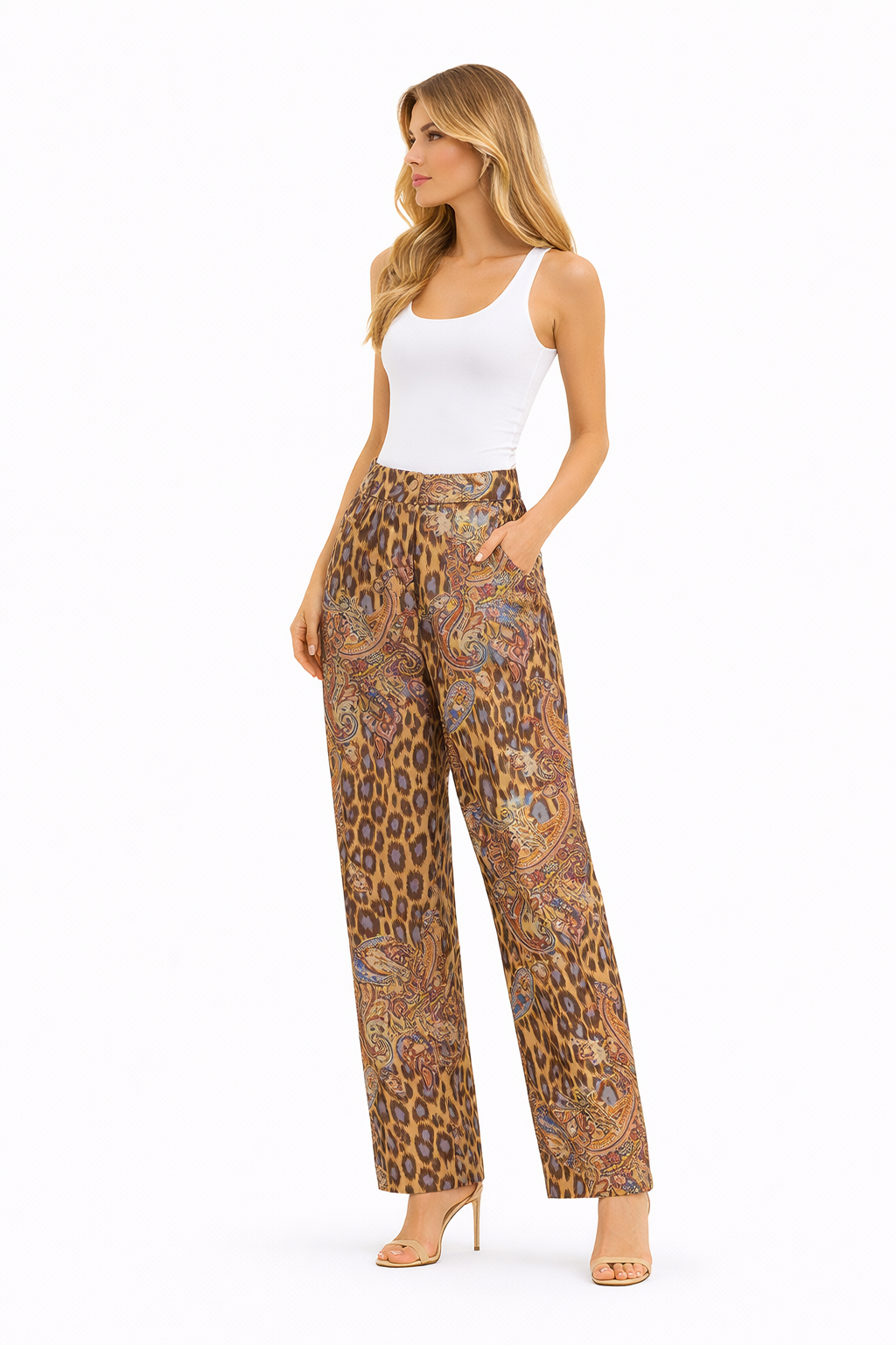 بنطلون واسع بطبعة مميزة تجمع بين نقشة الفهد والبيزلي بألوان دافئة وأنيقة، من ماركة هانيتا، أصلي 100%، بقصة مريحة وخصر عالي يمنحك إطلالة جريئة وفخمة في نفس الوقت.