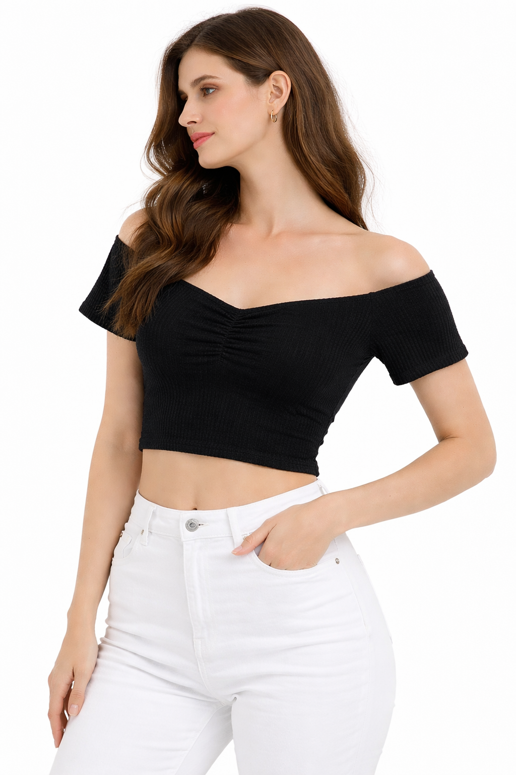 تتميز بلوزات "هانيتا" بتصاميم إيطالية عصرية اصلية 100 %بلوزة "كروب" سوداء بتصميم عصري يتميز بياقة واسعة جداً تبرز منطقة الكتفين وأكمام قصيرة ضيقة. مصنوعة من قماش مضلع (Ribbed) عالي المرونة يوفر ملاءمة مثالية للجسم، مما يجعلها قطعة أساسية وجذابة لإطلالتك الكاجوال. "Hanita