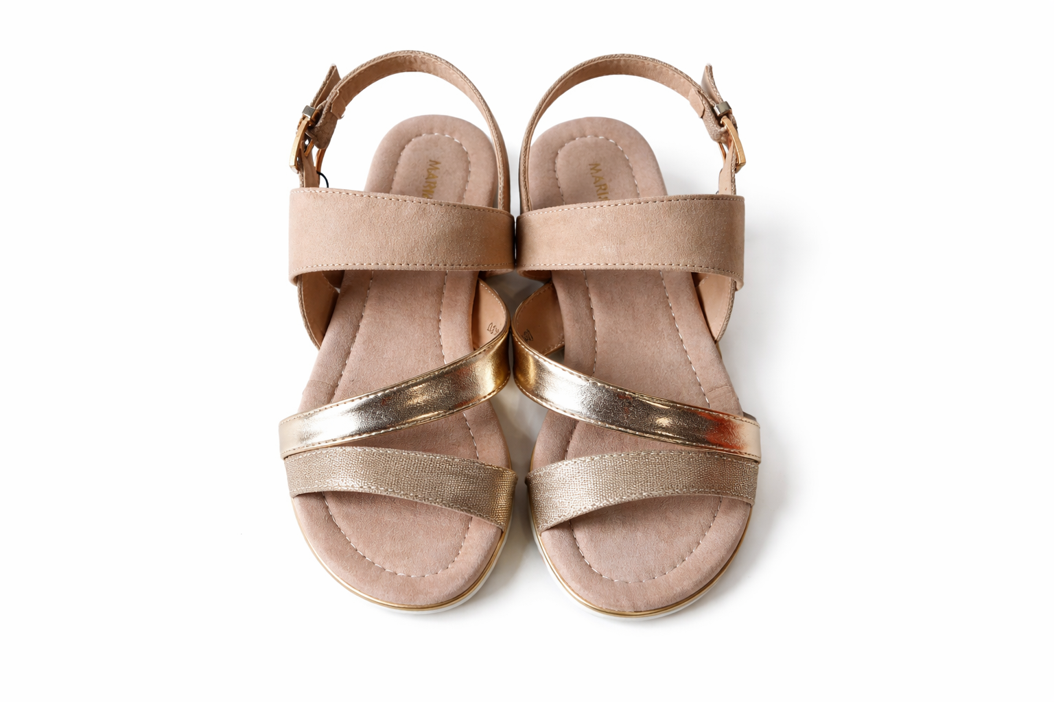 Mariamare براند أحذية نسائي عصرية بتصميمات أنيقة وجودة عالية، أصلي 100% ومصنوع في إسبانيا ليجمع بين الموضة والراحة في كل خطوة. صندل نسائي مريح يجمع بين قماش الشمواه والسيور الذهبية اللامعة من ماركة MARIAMARE، يتميز بنعل طبي مريح وسوار كاحل قابل للتعديل لإطلالة صيفية أنيقة.