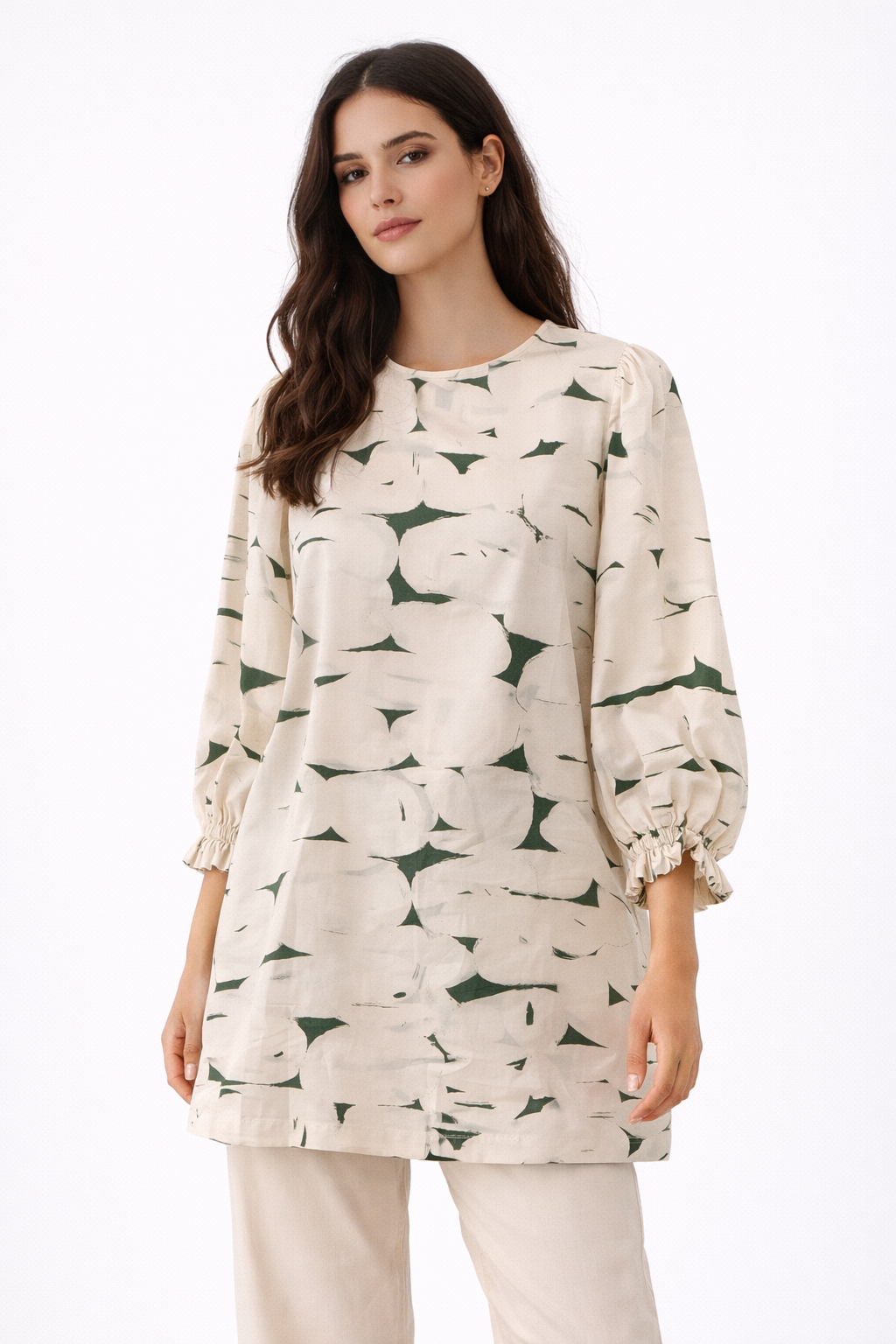 تونيك (Hanita) بتصميم واسع وأنيق بلون بيج هادئ مع نقشة هندسية باللون الأخضر وأكمام طويلة بكشكشة ناعمة تمنحك إطلالة عصرية ومريحة.