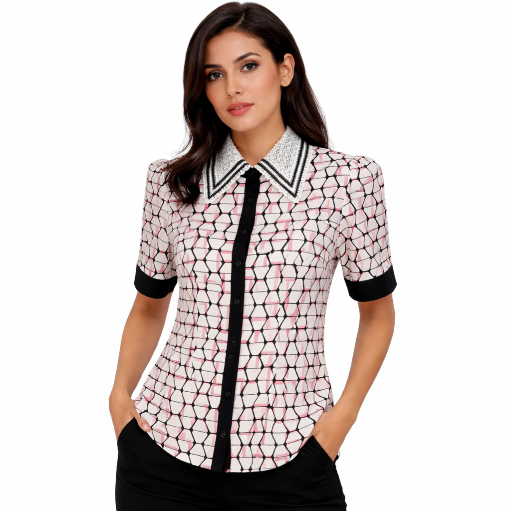 بلوزات هانيتا تجمع بين الأناقة العملية والخامة المريحة، بتصميمات عصرية تناسب الإطلالات اليومية والرسمية. خامات عالية الجودة وقصّات أنيقة تمنحك مظهرًا راقيًا وسهل التنسيق. بلوزة أنيقة بنقشة هندسية ناعمة وأكمام قصيرة، تتميز بياقة كلاسيكية مطرزة وتفاصيل سوداء متباينة تمنحكِ مظهراً رسمياً وراقياً