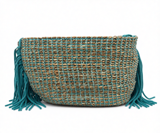 حقيبة أنيقة بتصميم نصف دائري مصنوعة من خامات مجدولة تجمع بين درجات التركواز والبيج لإطلالة طبيعية مميزة. مزودة بشرّابات جانبية تضيف لمسة عصرية، مثالية لإطلالات الصيف والكاجوال.