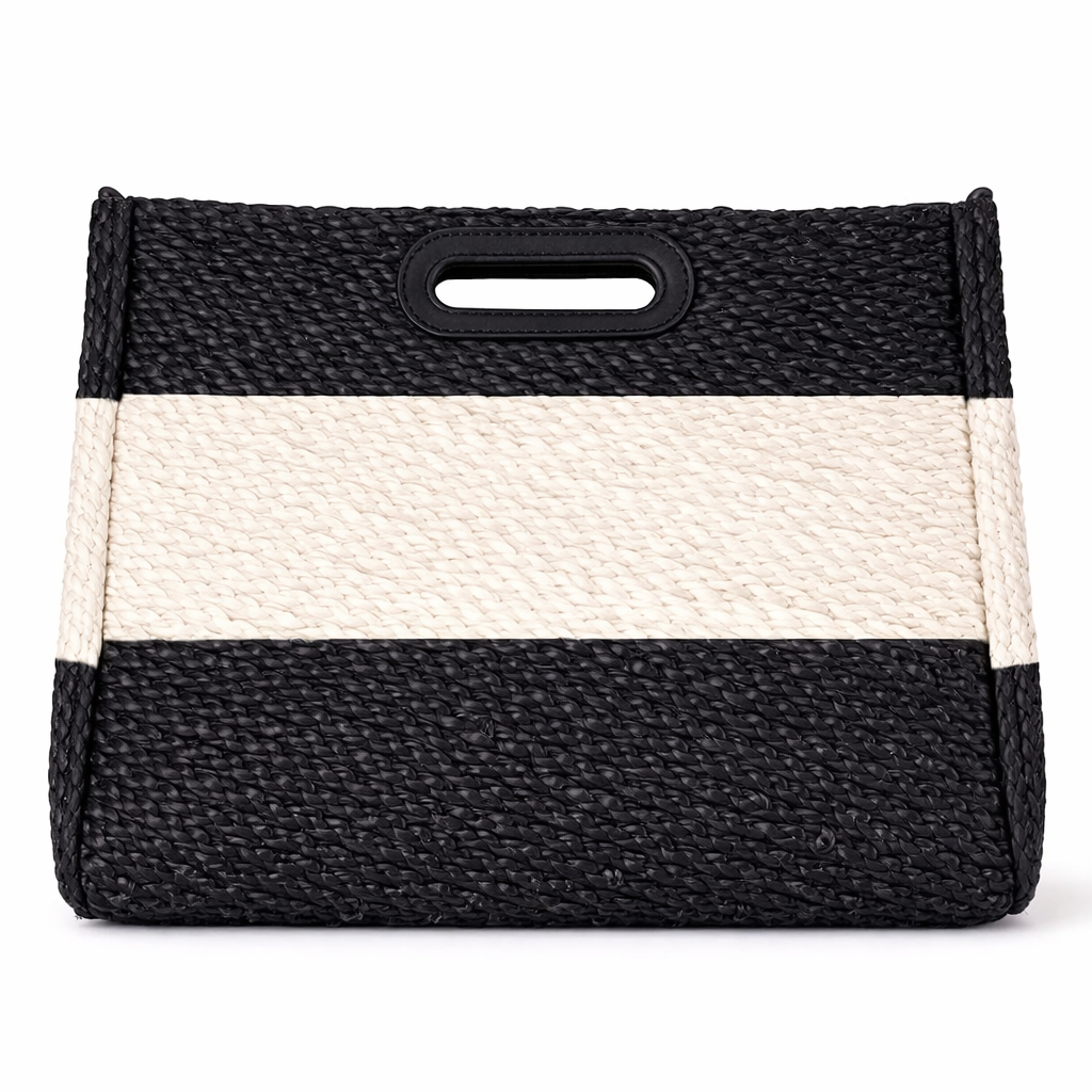 شنطة يد صيفية من براند Alex Max بتصميم منسوج أنيق باللون الأسود مع شريط أوف وايت في المنتصف ولمسة عصرية مميزة. عملية وخفيفة، مثالية لإطلالات الكاجوال الراقية سواء في الخروجات اليومية أو الرحلات الصيفية.