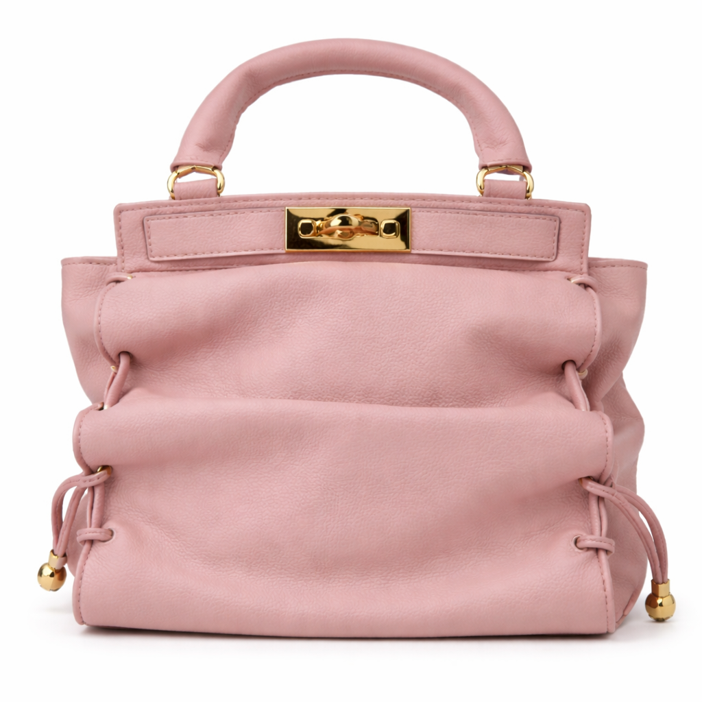 شنطة يد أنيقة بتصميم ناعم وعصري، مصنوعة من جلد ناعم باللون الوردي الهادئ يمنحها مظهراً أنثوياً راقياً. تتميز بتفاصيل مجمعة على الجانبين مع أربطة رفيعة ولمسات معدنية ذهبية فاخرة، بالإضافة إلى مقبض علوي مبطن يمنحها طابعاً مميزاً. مثالية للإطلالات اليومية الأنيقة والمناسبات الخاصة.
