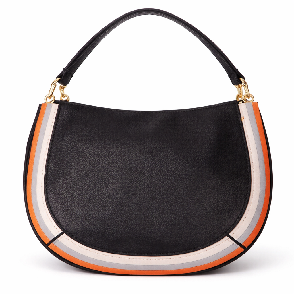 حقيبة يد أنيقة بتصميم نصف دائري مميز، مصنوعة من خامة جلد ناعم باللون الأسود مع تفاصيل جانبية بخطوط عصرية باللون البرتقالي والأوف وايت والرمادي. مزودة بحزام كتف مريح وإكسسوارات ذهبية تضيف لمسة فخامة تناسب الإطلالات اليومية والعملية.