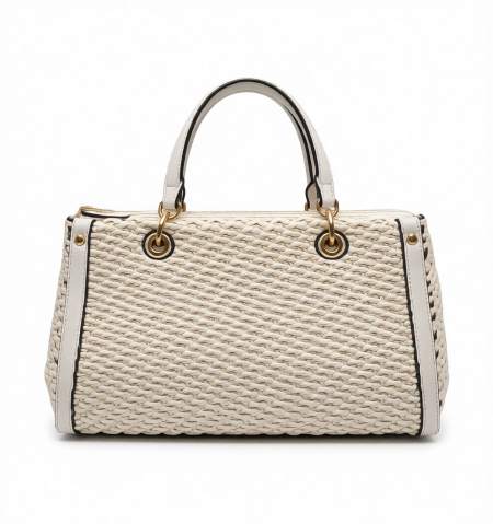 حقيبة إيطالية من (Alex Max) بتصميم منسوج باللون العاجي (أوف وايت)، تتميز بلمسات ذهبية راقية تمنحها مظهراً صيفياً وعصرياً جذاباً.