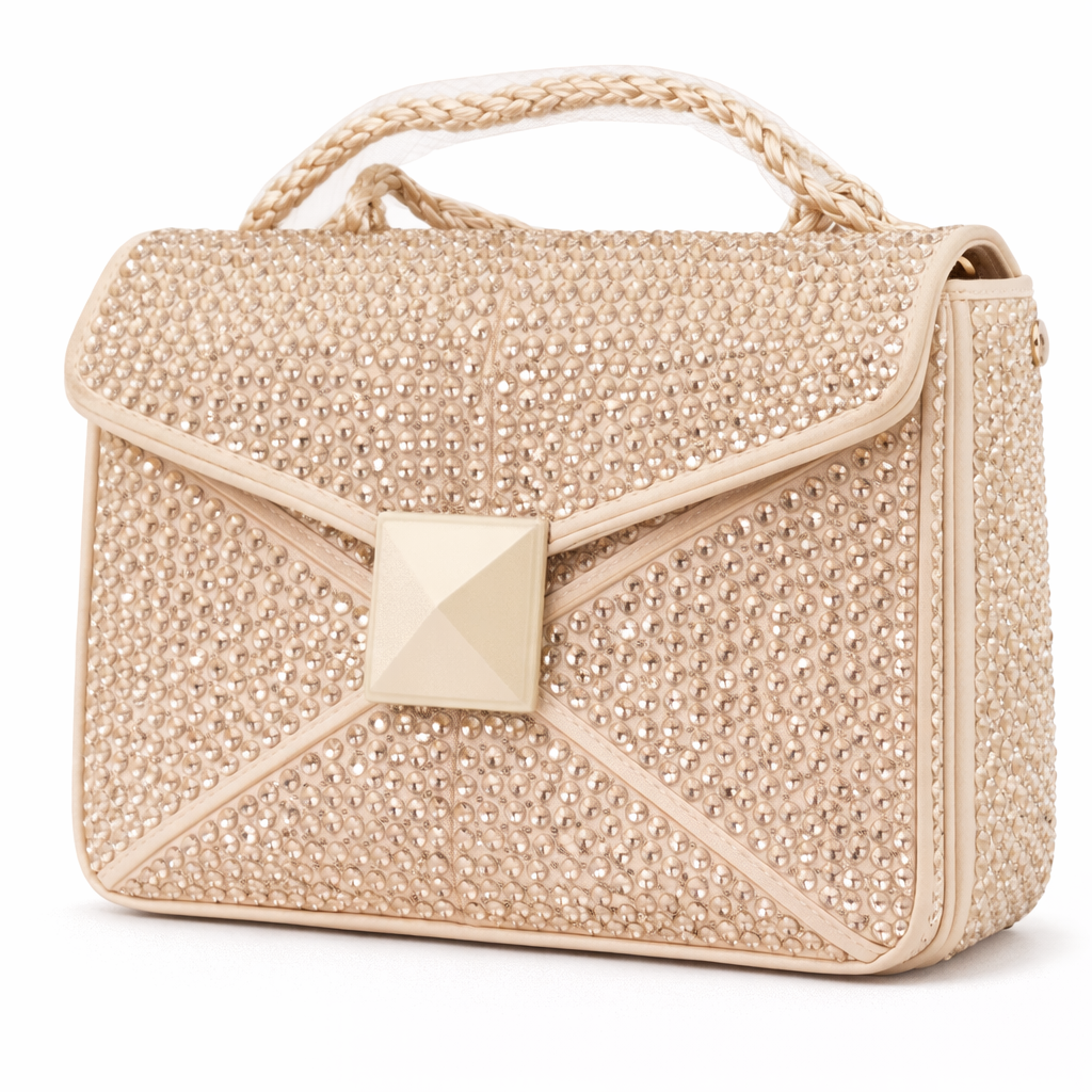 حقيبة سهرة فاخرة باللون الشامبين الذهبي، مرصعة بالكامل بحبيبات لامعة تضفي لمسة راقية وجذابة. تتميز بقفل أمامي مربع أنيق ومقبض علوي مجدول، مثالية للمناسبات والسهرات بإطلالة أنثوية مميزة.
