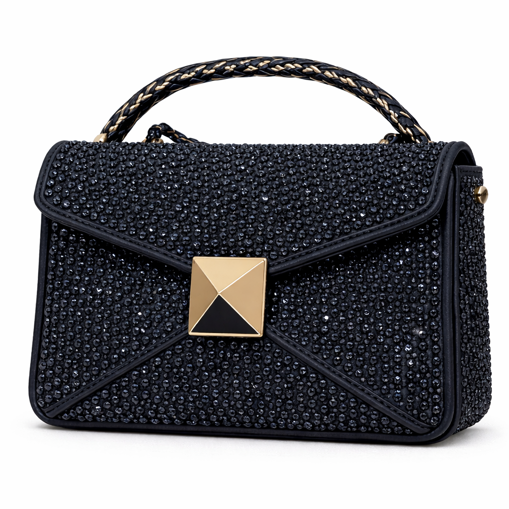 حقيبة سهرة أنيقة باللون الأسود اللامع، مغطاة بالكامل بحبيبات لامعة تضيف لمسة فاخرة وجذابة. تتميز بقفل أمامي ذهبي أنيق ومقبض علوي مجدول بتفاصيل ذهبية، مثالية لإطلالة مسائية راقية ومميزة.