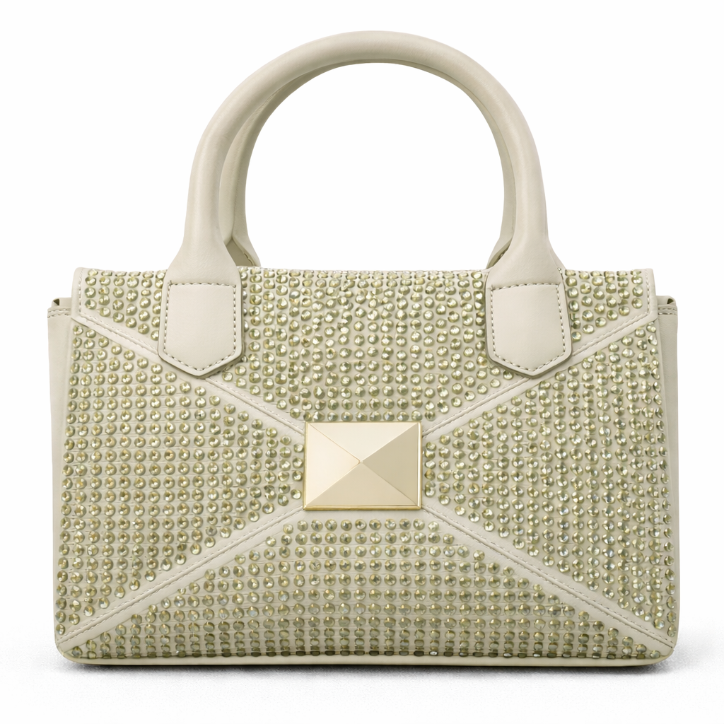 ححقيبة أنيقة باللون البيج الفاتح، مرصعة بالكامل بفصوص لامعة تمنحها لمسة فاخرة وبراقة. تتميز بقفل أمامي مربع باللون الذهبي ومقابض علوية ثابتة، مثالية للسهرات والمناسبات الخاصة بإطلالة راقية.
