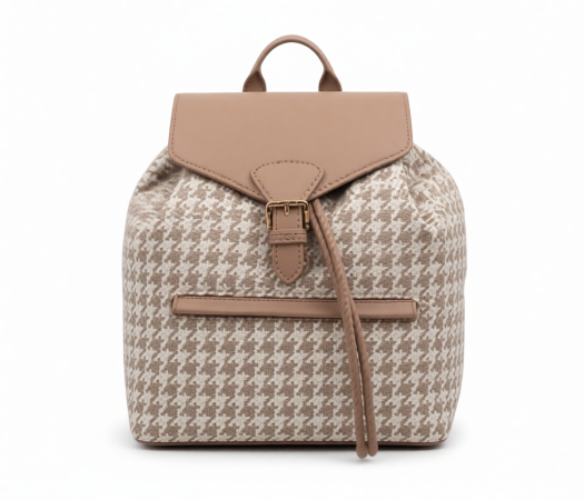 حقيبة ظهر أنيقة بتصميم عصري تجمع بين نقشة الهوندستوث الكلاسيكية وغطاء علوي من الجلد الناعم باللون البيج. مزودة بقفل معدني أنيق وجيب أمامي عملي، لتمنحكِ مزيجًا مثاليًا من الأناقة والوظيفة للاستخدام اليومي.