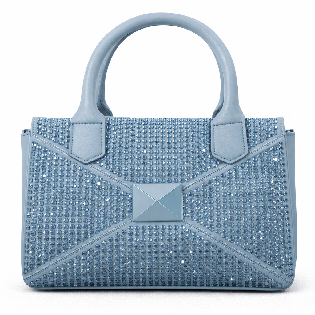 حقيبة أنيقة باللون الأزرق الفاتح مرصعة بالكامل بفصوص لامعة تضفي لمسة ناعمة ومشرقة على إطلالتك. تتميز بقفل أمامي مربع بنفس اللون ومقابض علوية ثابتة، مثالية للسهرات والمناسبات بإطلالة راقية وأنثوية.
