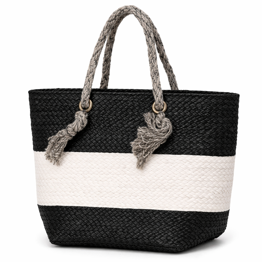 شنطة يد صيفية أنيقة من براند Alex Max بتصميم منسوج يجمع بين الأسود والأوف وايت لمظهر عصري جذاب. اليد المصنوعة من الحبال مع تفاصيل الشرّابات تضيف لمسة مميزة، مثالية لإطلالات البحر والكاجوال الراقية.