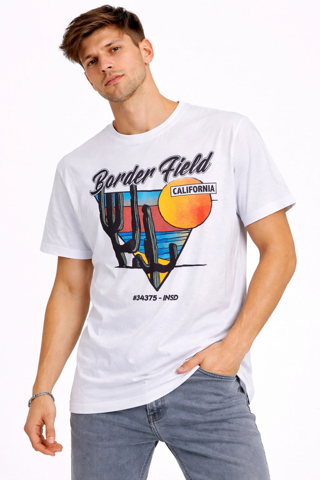 تيشيرت رجالي باللون الأبيض مزين بطبعة جرافيك مميزة مستوحاة من أجواء كاليفورنيا الصحراوية مع تصميم الشمس والصبار (inside). يتميز بقصة مريحة وخامة ناعمة مناسبة للاستخدام اليومي، ليمنحك إطلالة كاجوال عصرية ولمسة شبابية جذابة.