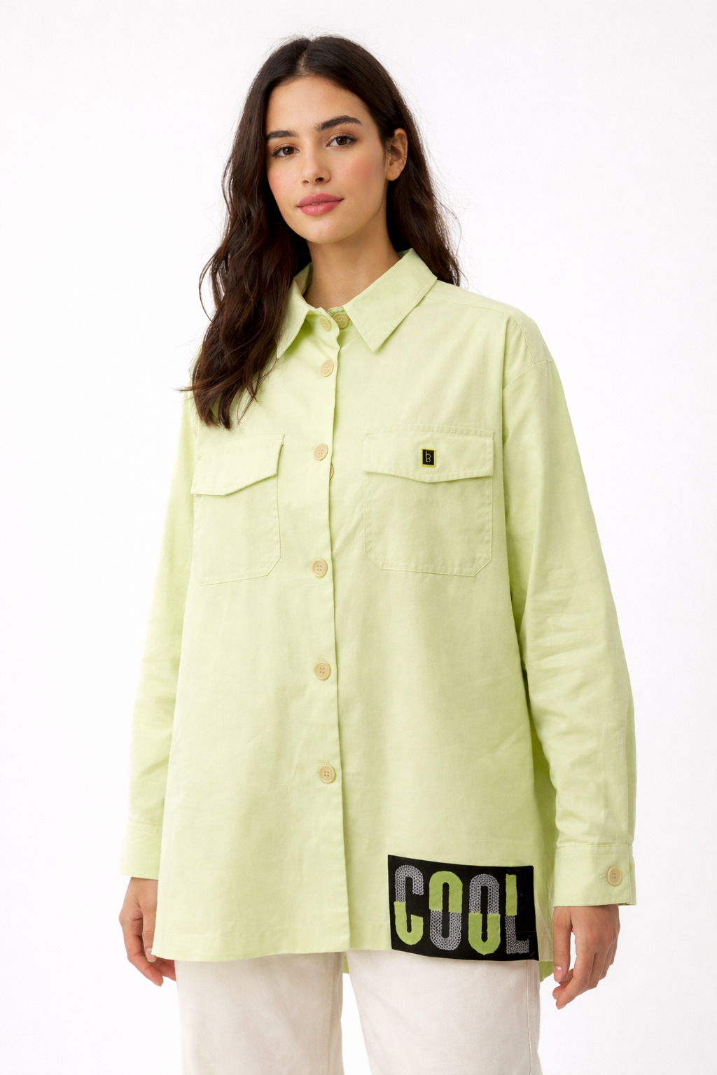 قميص كاجوال أوفر سايز (Oversized) باللون الأخضر الفاتح. يتميز بتصميم عصري يجمع بين الطابع العملي بجيوب أمامية مزدوجة، واللمسة الشبابية بطبعة "COOL" بارزة في الأسفل. قطعة مثالية لإطلالة "ستريت وير" مريحة ومميزة.(Hanita)