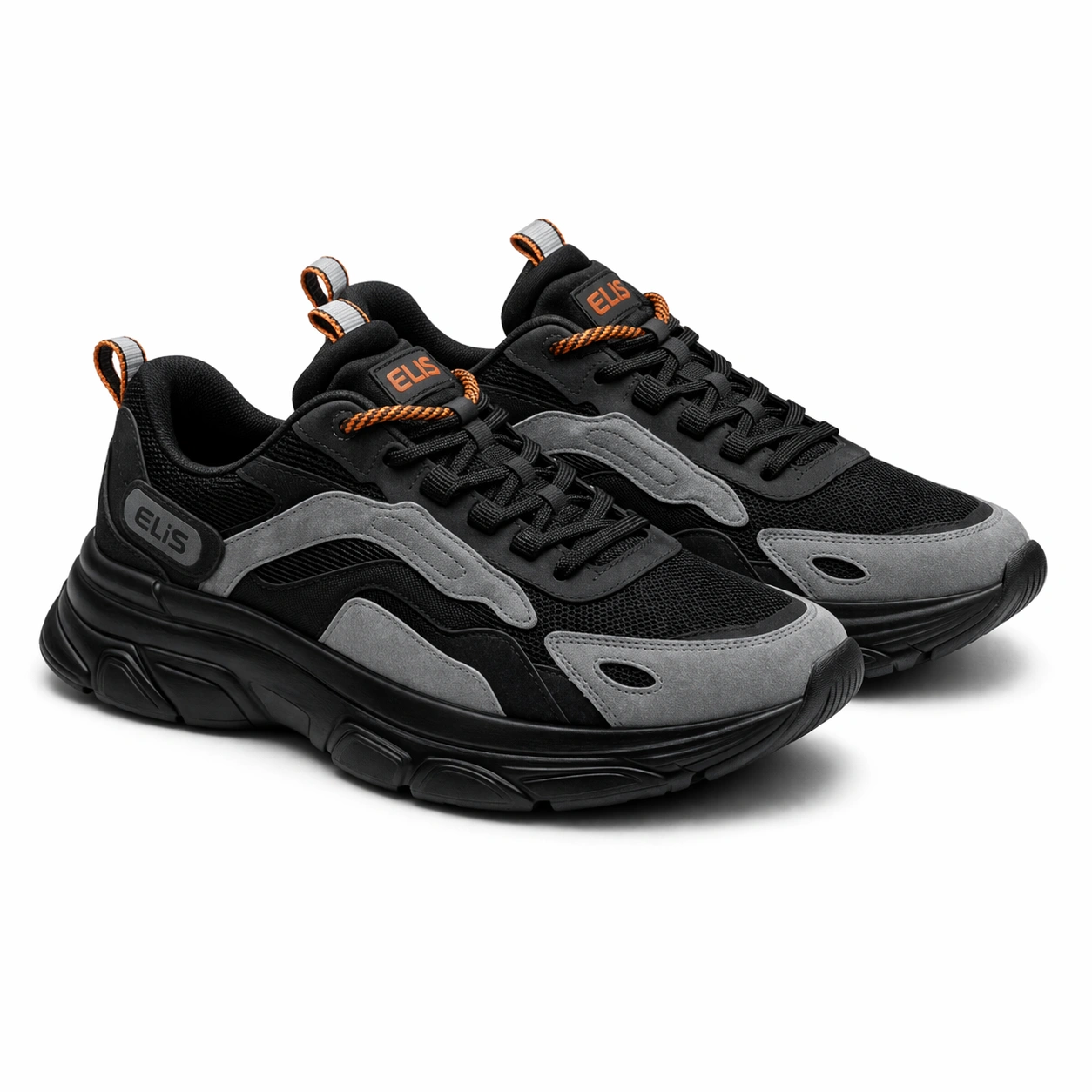 يتميز هذا الموديل بتصميم "تشونكي" (Chunky) ضخم مستوحى من أحذية التسعينيات، يدمج بين اللون الأسود الأساسي وقطع رمادية داكنة (Dark Grey) موزعة بشكل انسيابي، مع لمسات برتقالية (Orange) حيوية تضفي طابعاً تقنياً وعصرياً