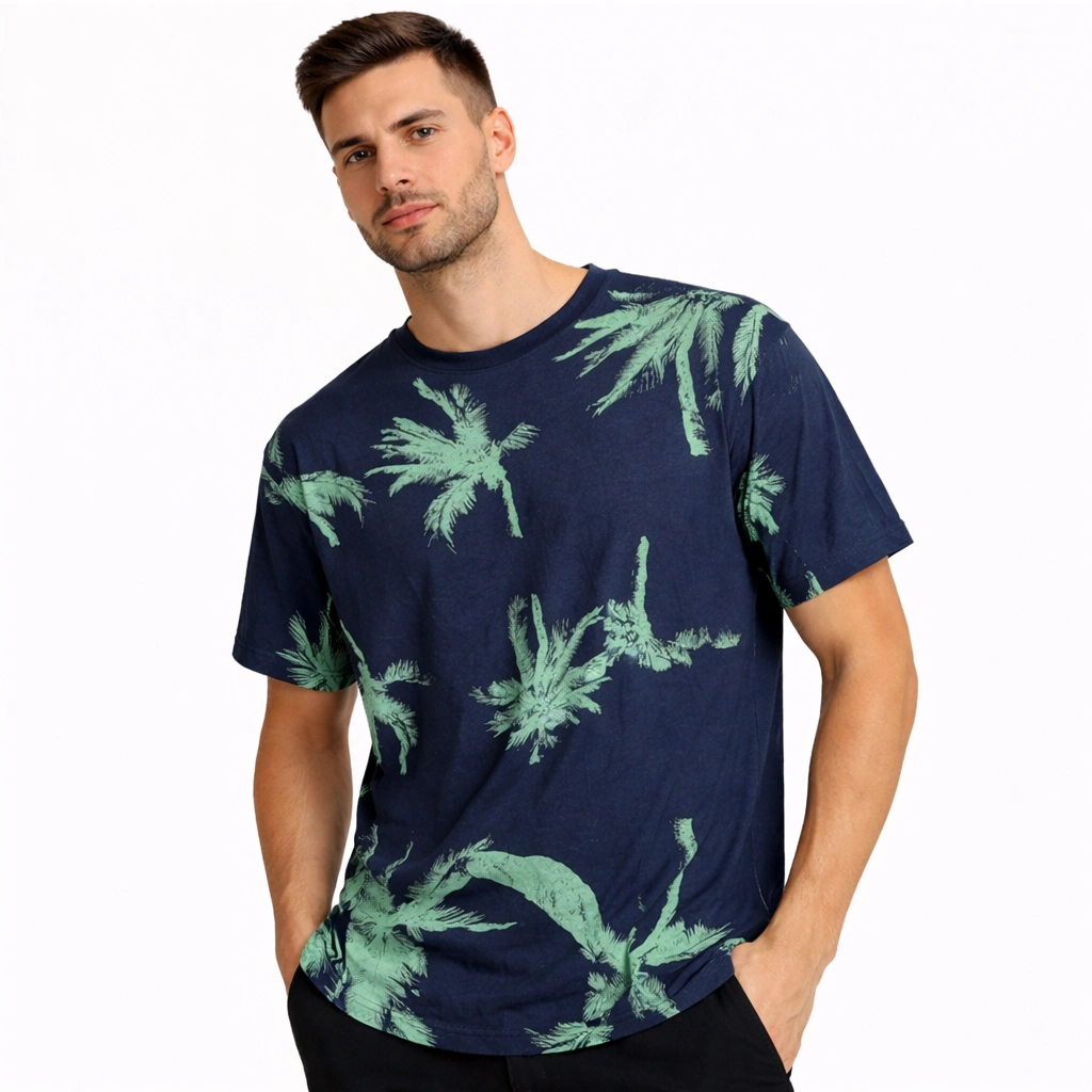 هذا التيشيرت باللون الكحلي يتميز بتصميم استوائي عصري يحمل نقوش نخيل باللون الأخضر الفاتح، مما يمنحه مظهرًا منعشًا ومناسبًا لأجواء الصيف. التباين بين الخلفية الداكنة والنقوش الزاهية يضيف لمسة أنيقة تجمع بين الجرأة والبساطة في نفس الوقت.