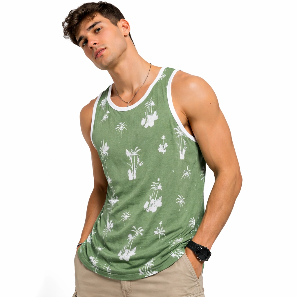 يتميز هذا التيشيرت بدون أكمام بلون زيتي هادئ ومريح للعين، يزينه نقش كامل لأشجار النخيل باللون الأبيض، مما يمنحك تصميماً استوائياً مثالياً للعطلات والأجواء الصيفية المريحة من IN SIDE.