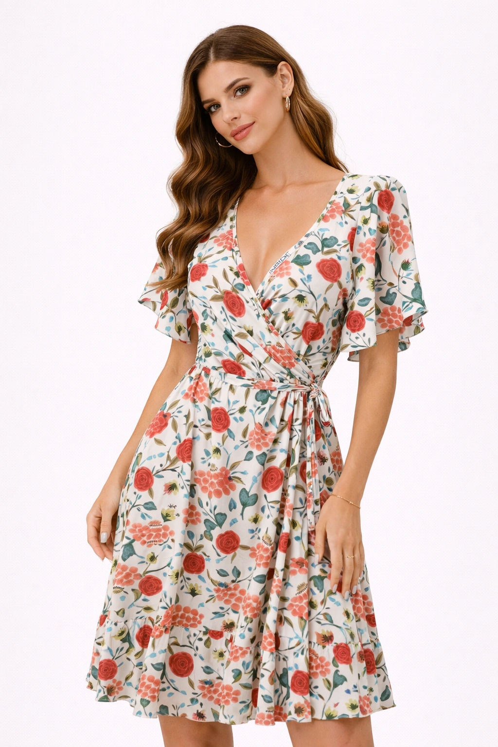 فستان نسائي أنيق بطبعة ورود جذابة يمنحك إطلالة صيفية ناعمة ومميزة. يتميز بقصة مريحة مع أكمام واسعة وتصميم لفّ عند الصدر يبرز جمال القوام، بالإضافة إلى خصر محدد يمنح الفستان شكلًا أنثويًا أنيقًا. مصنوع بخامة خفيفة ومريحة تناسب الإطلالات اليومية والمشاوير الصيفية. الفستان من ماركة INSIDE الأصلية المعروفة بتصاميمها العصرية وجودة خاماتها.