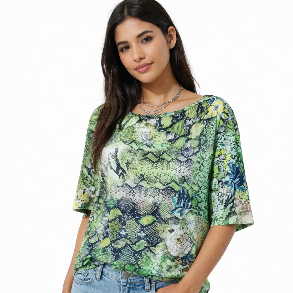 تيشيرت حريمي بنقشة الثعبان والزهور الخضراء (IN SIDE)