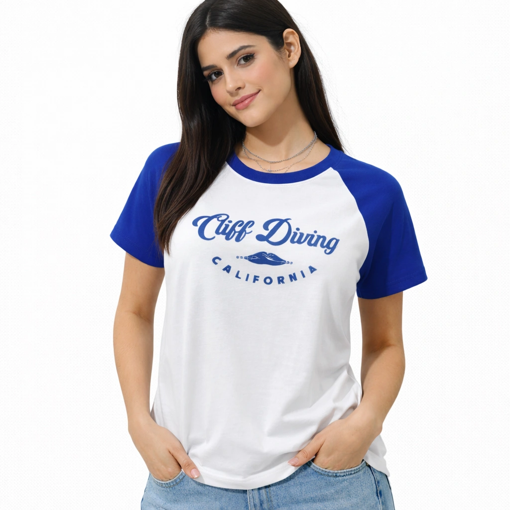 يتميز هذا التيشيرت بتصميم "راجلان" (Raglan) الكلاسيكي، حيث يمتزج اللون الأبيض الناصع مع أكمام قصيرة باللون الأزرق الزاهي، ويزينه شعار "Cliff Diving California" الذي يمنحكِ إطلالة كاجوال مريحة مستوحاة من أجواء الشواطئ والمغامرة من IN SIDE.