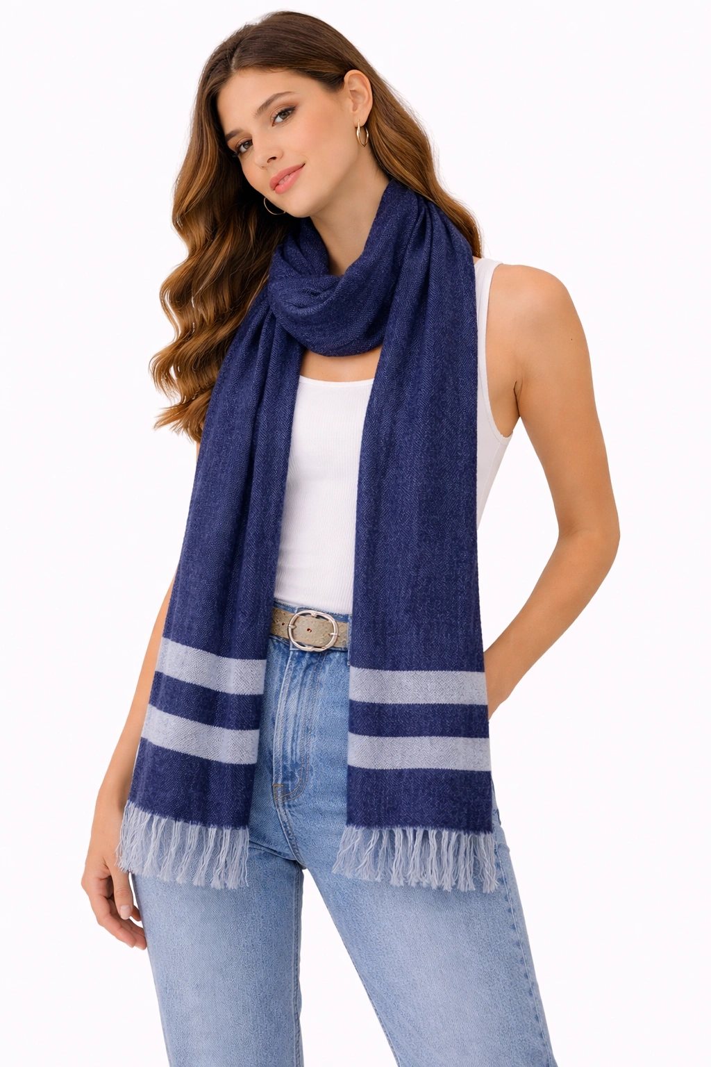 شال أنيق باللون الكحلي مع خطوط فاتحة من ماركة INSIDE، يتميز بتصميم عصري بسيط يناسب الإطلالات اليومية والكاجوال. مصنوع من خامة ناعمة وخفيفة تمنحك الدفء والراحة، ويأتي بأطراف مزينة بشراشيب تضيف لمسة أنيقة. يمكن تنسيقه بسهولة مع مختلف الملابس ليكمل مظهرك بأسلوب عصري وجذاب.