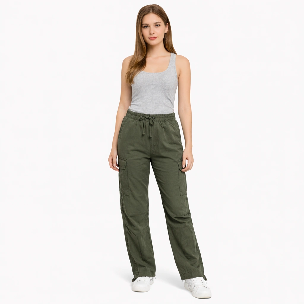 بنطلون كارجو زيتوني مريح بقصة أرجل مستقيمة. يتميز بخصر مرن برباط وجيوب جانبية عملية، مصمم ليعطي مظهراً يومياً كاجوال وعصري.