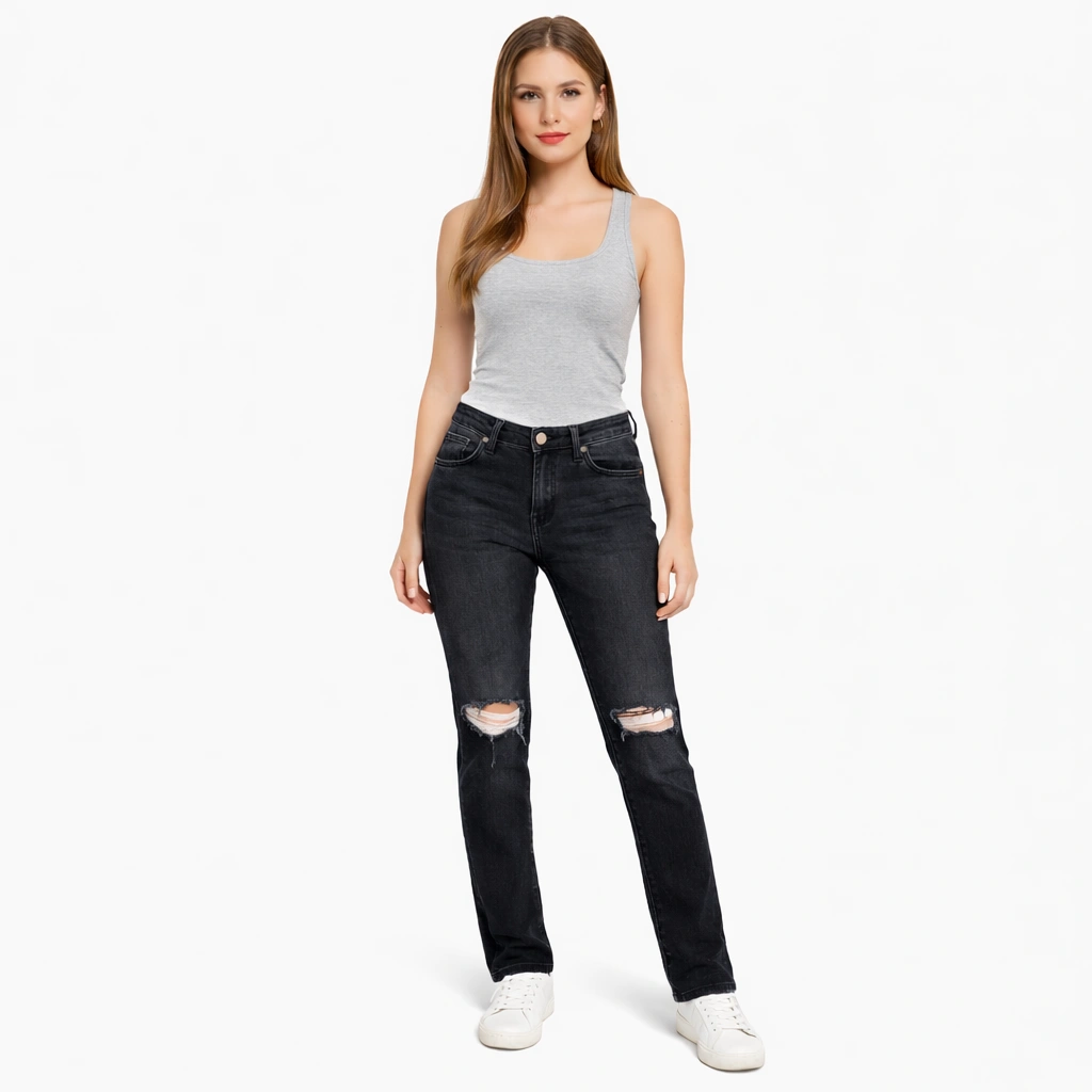 جينز أسود "سليم فيت" بلمسة باهتة عصرية وتفاصيل تمزيق جريئة على الركبة تمنحك إطلالة شبابية وكاجوال مميزة.