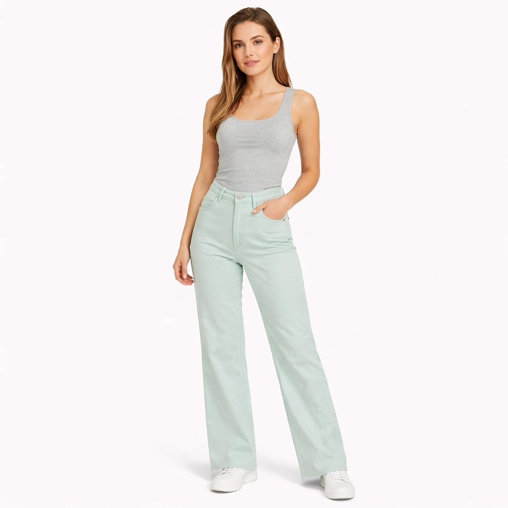 جينز واسع الساق بلون أخضر نعناعي باهت ومنعش، بخصر مرتفع يمنحك إطلالة عصرية ومريحة تناسب الأيام المشمسة.
