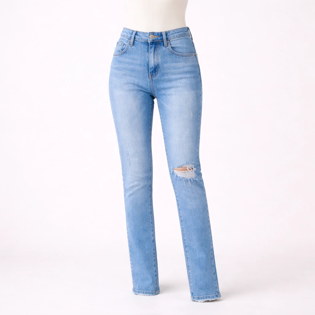 جينز أزرق فاتح بلمسة باهتة عصرية وتفاصيل تمزيق خفيفة على الركبة، يمنحك إطلالة "كاجوال" حيوية ومريحة تناسب النزهات اليومية.