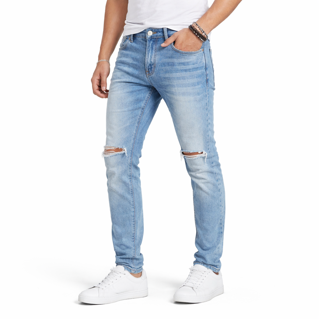 بنطلون جينز رجالي أزرق فاتح بتصميم عصري وتفاصيل ممزقة أنيقة، يمنحك إطلالة كاجوال شبابية ومريحة.