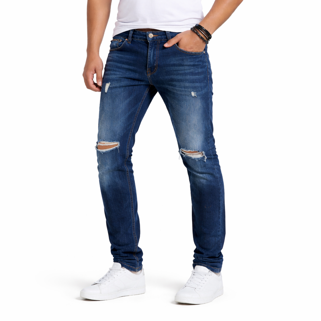 بنطلون جينز رجالي أزرق بتصميم عصري وتفاصيل ممزقة أنيقة، يمنحك إطلالة كاجوال شبابية ومريحة.