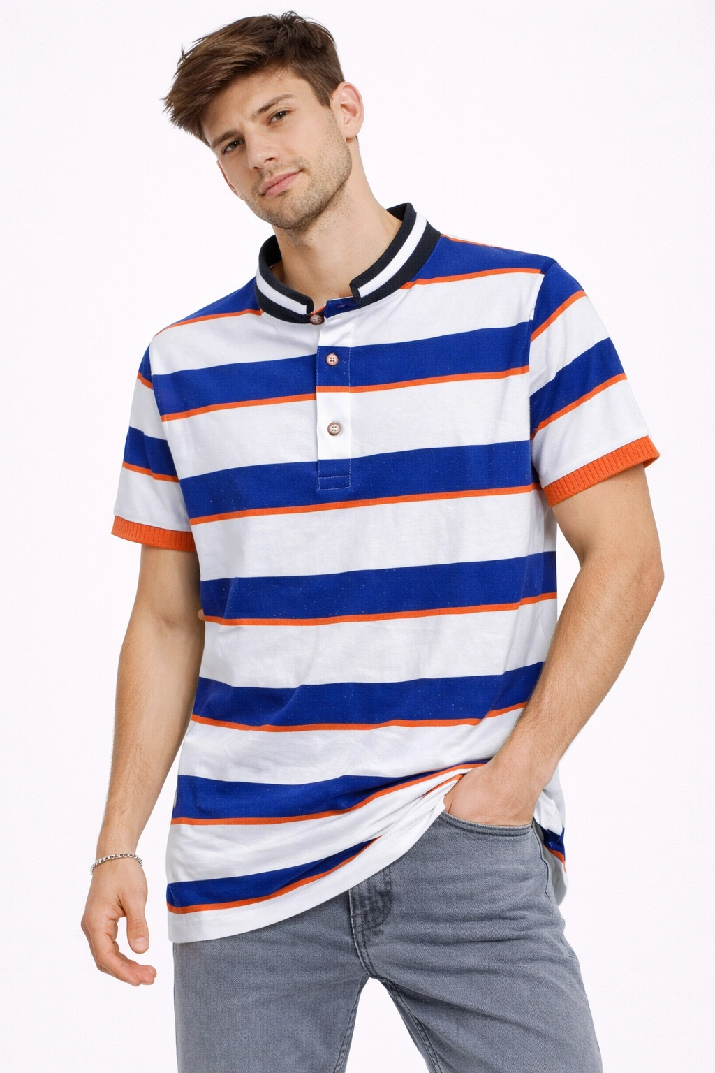 تيشيرت رجالي مخطط باللونين الأزرق والأبيض مع خطوط برتقالية مميزة (inside). يتميز بياقة عصرية بأزرار وأكمام بتفاصيل لونية جذابة تضيف لمسة شبابية أنيقة. خامة مريحة ومناسبة للاستخدام اليومي، مثالي لإطلالة كاجوال عصرية ومميزة.
