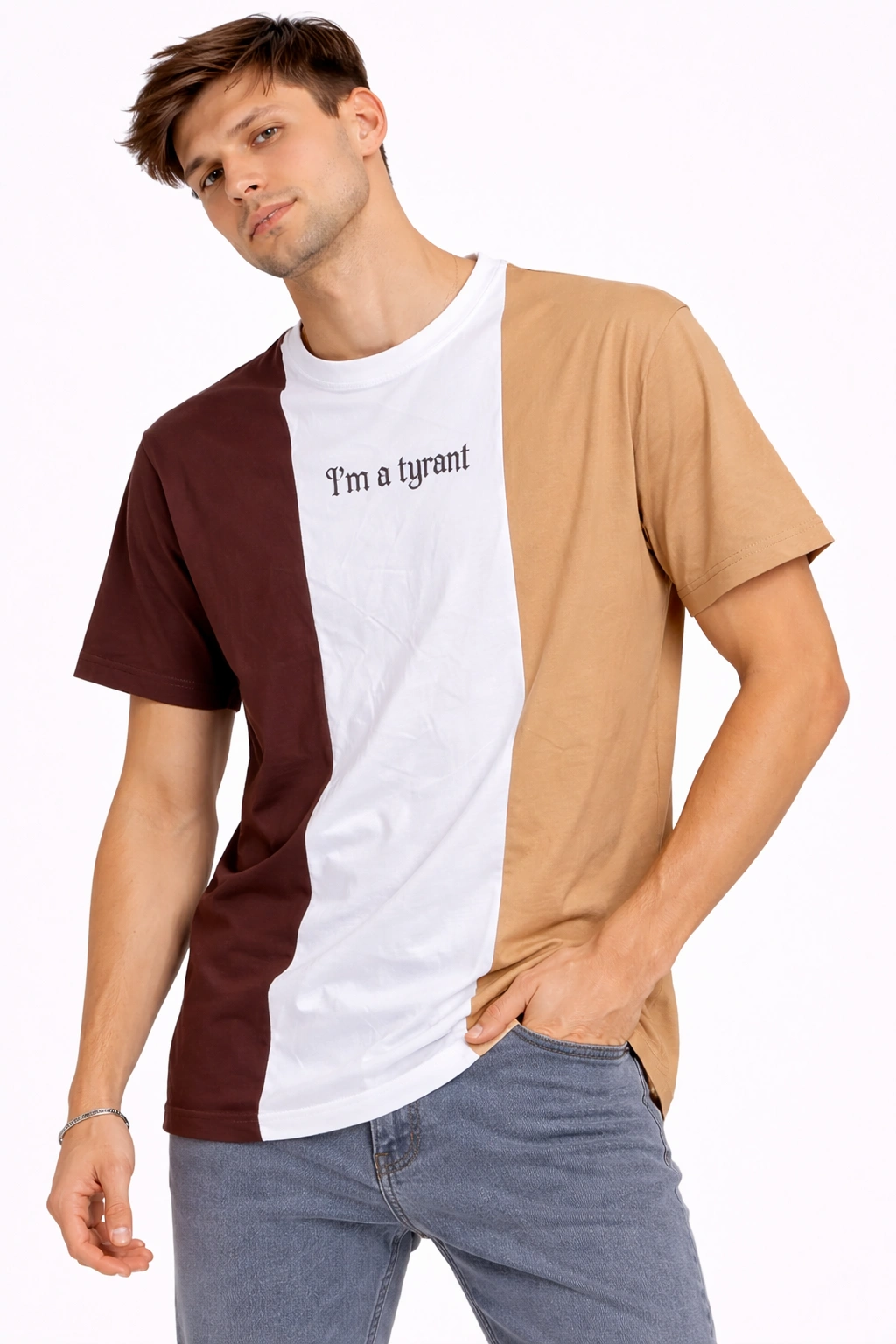 تيشيرت رجالي كولور بلوك ثلاثي (INSIDE) بتصميم عصري بألوان نبيتي وأبيض وبيج. مصنوع من خامة قطن مريحة بقصة عادية تناسب الاستخدام اليومي، وسهل التنسيق مع الجينز أو الشورت لإطلالة كاجوال أنيقة.