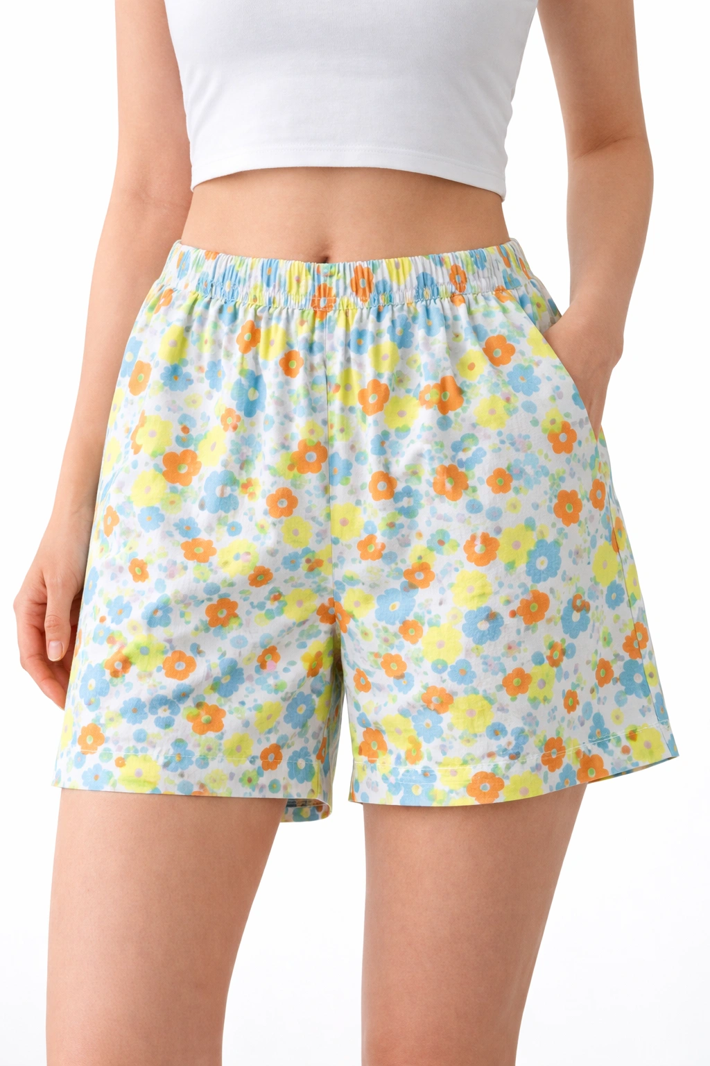 شورت صيفي بطبعة زهور ملونة بتدرجات الأصفر والبرتقالي والأزرق على خلفية فاتحة، يتميز بخصر مطاطي مريح يمنح سهولة في الارتداء وملاءمة مثالية. تصميمه الخفيف وقصته الواسعة نسبيًا يجعلان منه قطعة عملية ومثالية لإطلالات الصيف اليومية المنعشة (INSIDE).