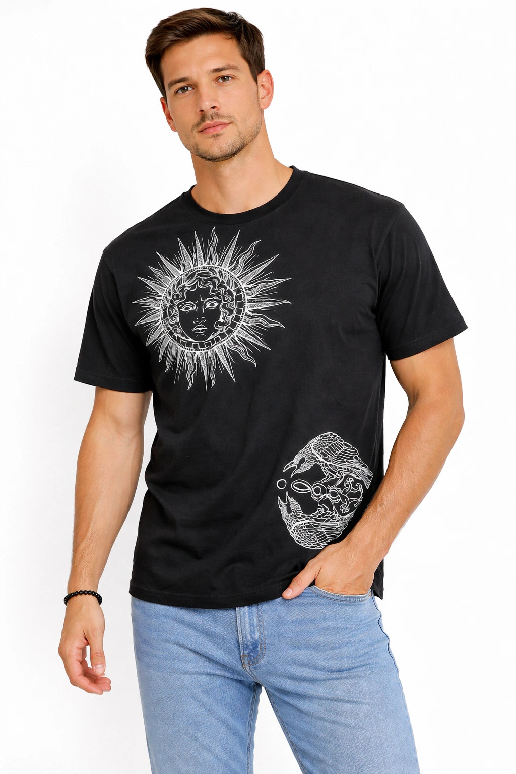 تيشيرت رجالي أسود بخامة قطن مريحة، يتميز بطباعة فنية مميزة مستوحاة من رموز الشمس والرسومات التجريدية، تمنحك إطلالة عصرية بطابع فني جريء. مثالي للوك الكاجوال اليومي.