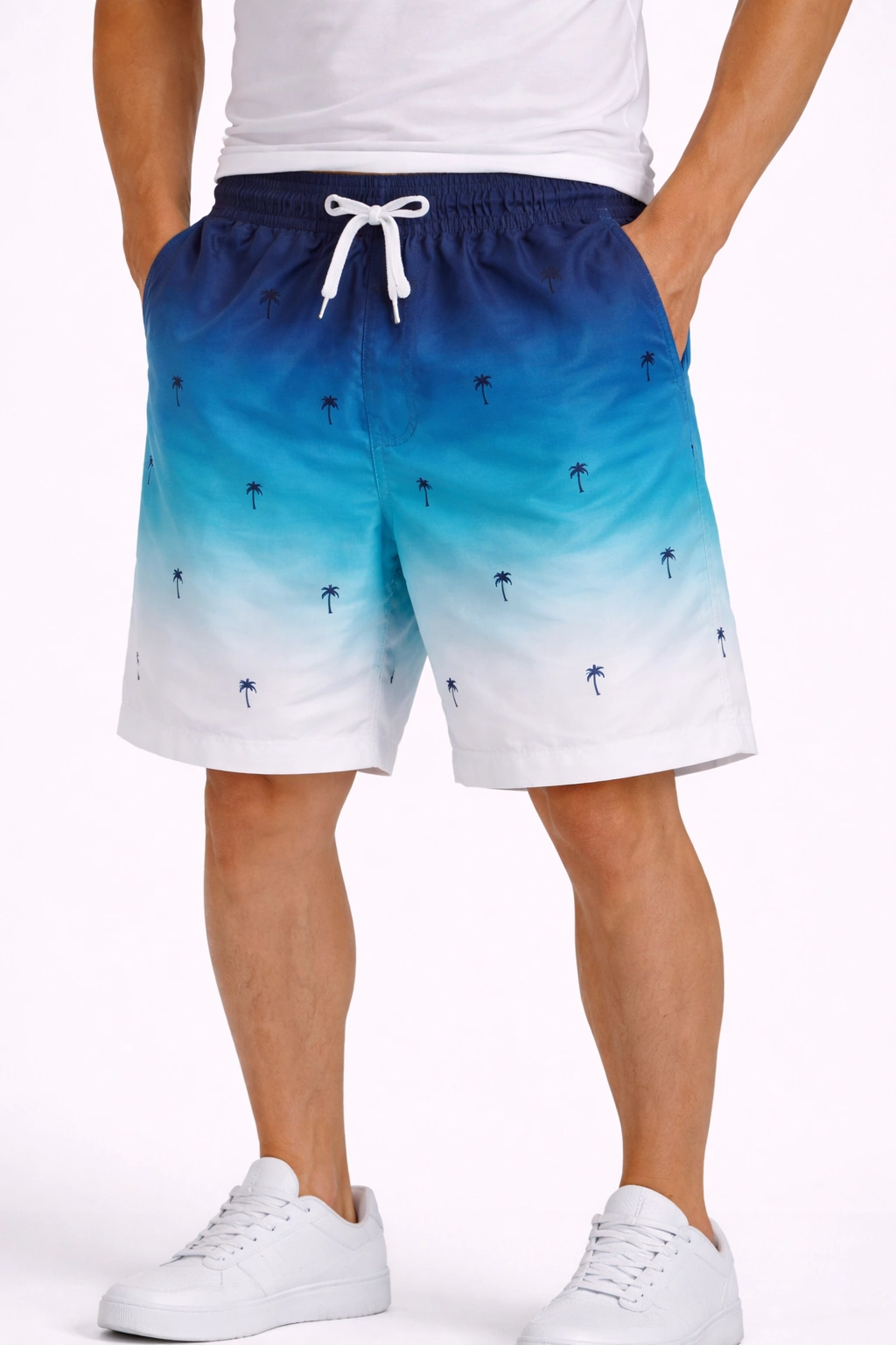 شورت رجالي من (INSIDE) بتدرج لوني أنيق من الكحلي إلى الأبيض مع طبعة نخيل صغيرة تمنحك طابع صيفي منعش. خامة خفيفة مع خصر مطاطي ورباط قابل للتعديل لراحة مثالية طوال اليوم.