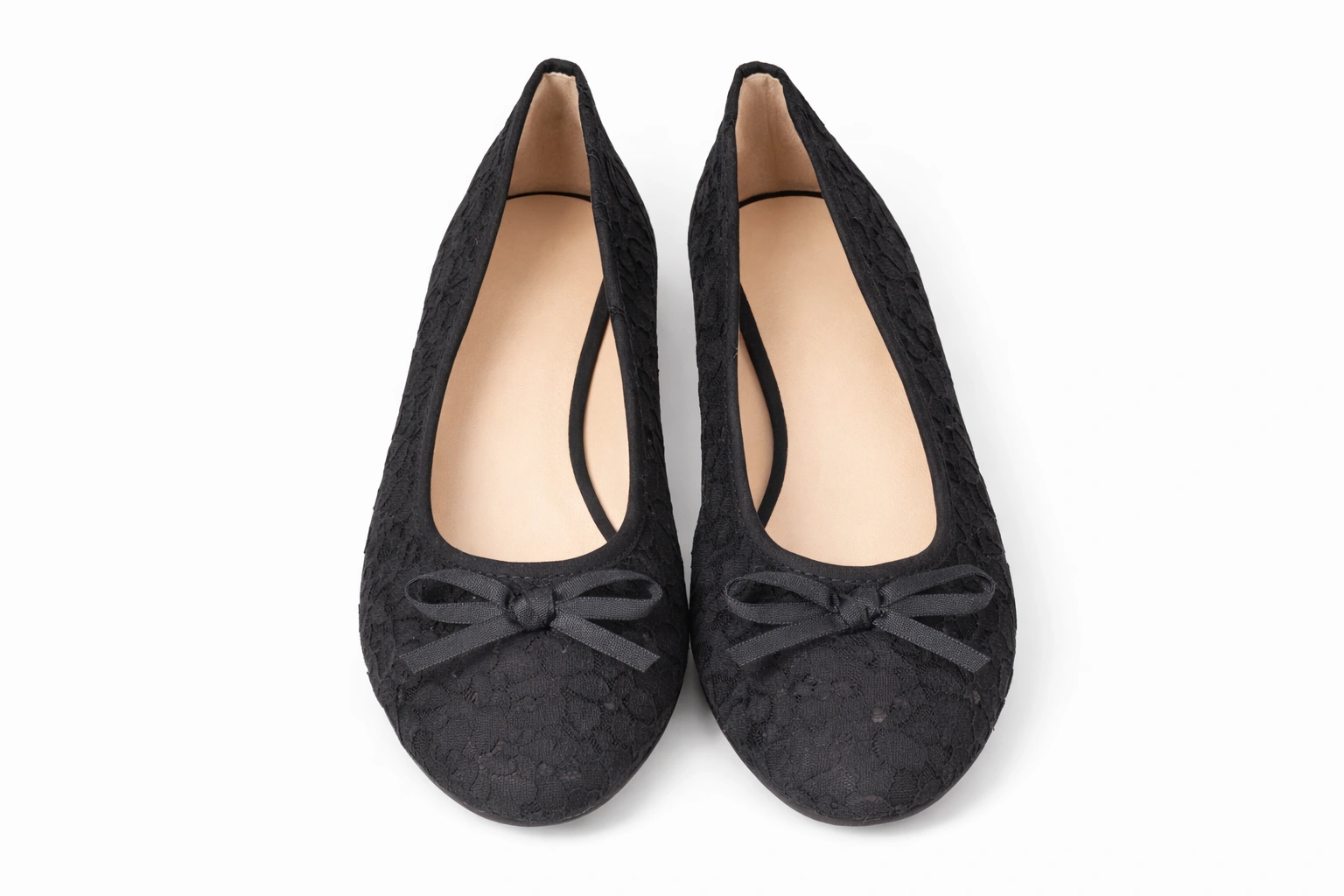 حذاء فلات نسائي من ماركة Inside بتصميم أنيق وناعم مناسب للاستخدام اليومي والإطلالات الكاجوال. يتميز باللون الأسود مع خامة دانتيل بتفاصيل رقيقة تضيف لمسة أنثوية مميزة، بالإضافة إلى فيونكة صغيرة على المقدمة تعزز من شكل التصميم. النعل خفيف ومريح للاستخدام اليومي. الصورة توضح الحذاء من الخلف لإبراز شكل الكعب والتصميم الخارجي.