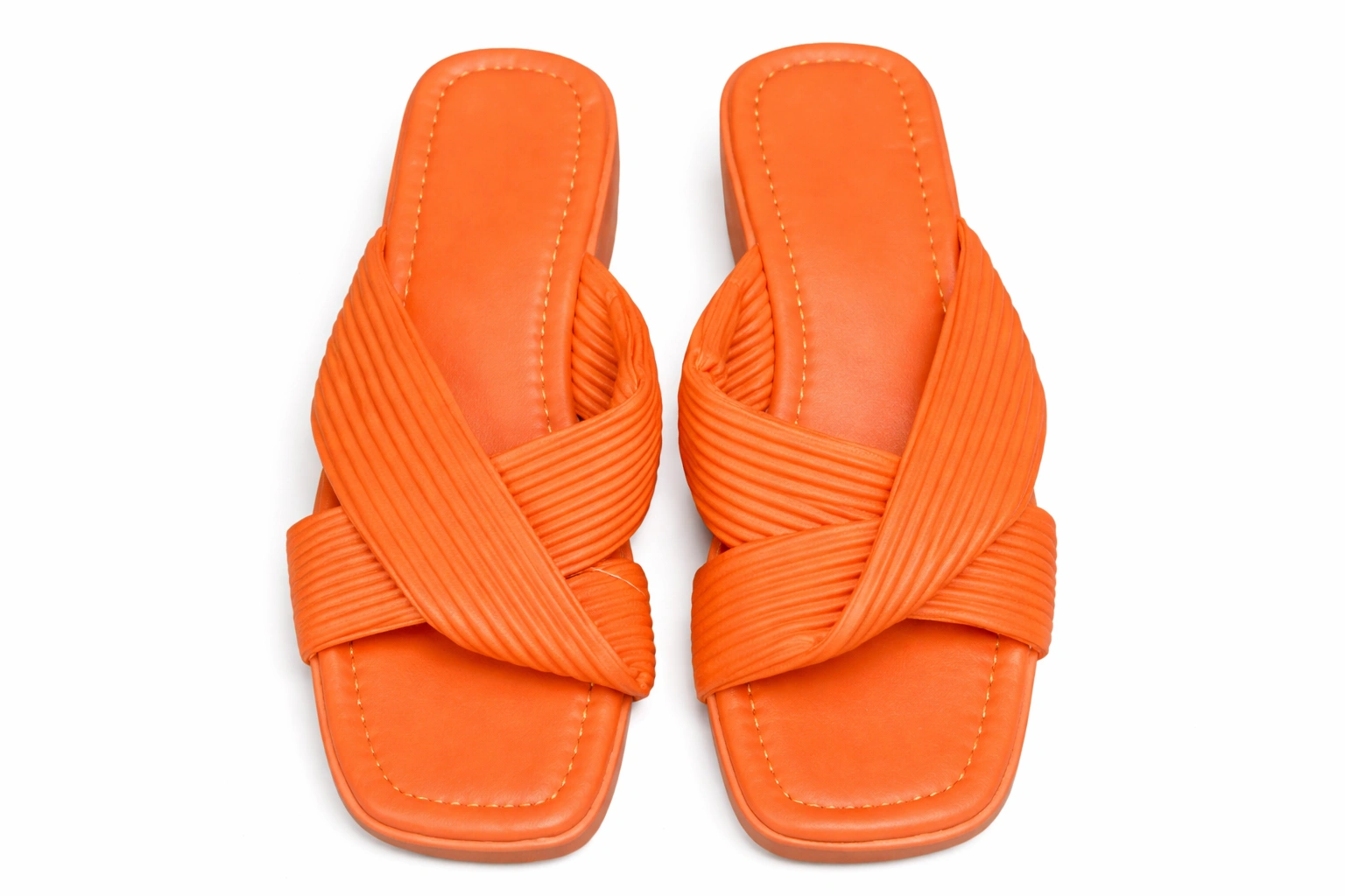 صندل نسائي من ماركة Inside بتصميم عصري مميز ولون برتقالي جريء يضيف لمسة حيوية للإطلالة. يتميز بأشرطة عريضة متقاطعة بتصميم كروس مع خامة مضلعة تعطي شكلًا أنيقًا وعصريًا. النعل مسطح ومريح للاستخدام اليومي، مما يجعله مناسبًا للمشي والخروجات الكاجوال. الصورة توضح الصندل من الخلف لإبراز شكل النعل والتصميم العام.